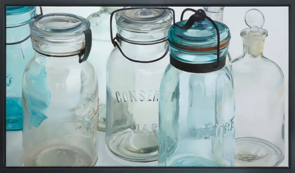 Open a larger version of the following image in a popup: Oil painting of 4 clear glass vessels on white table cloth on linen Installation View